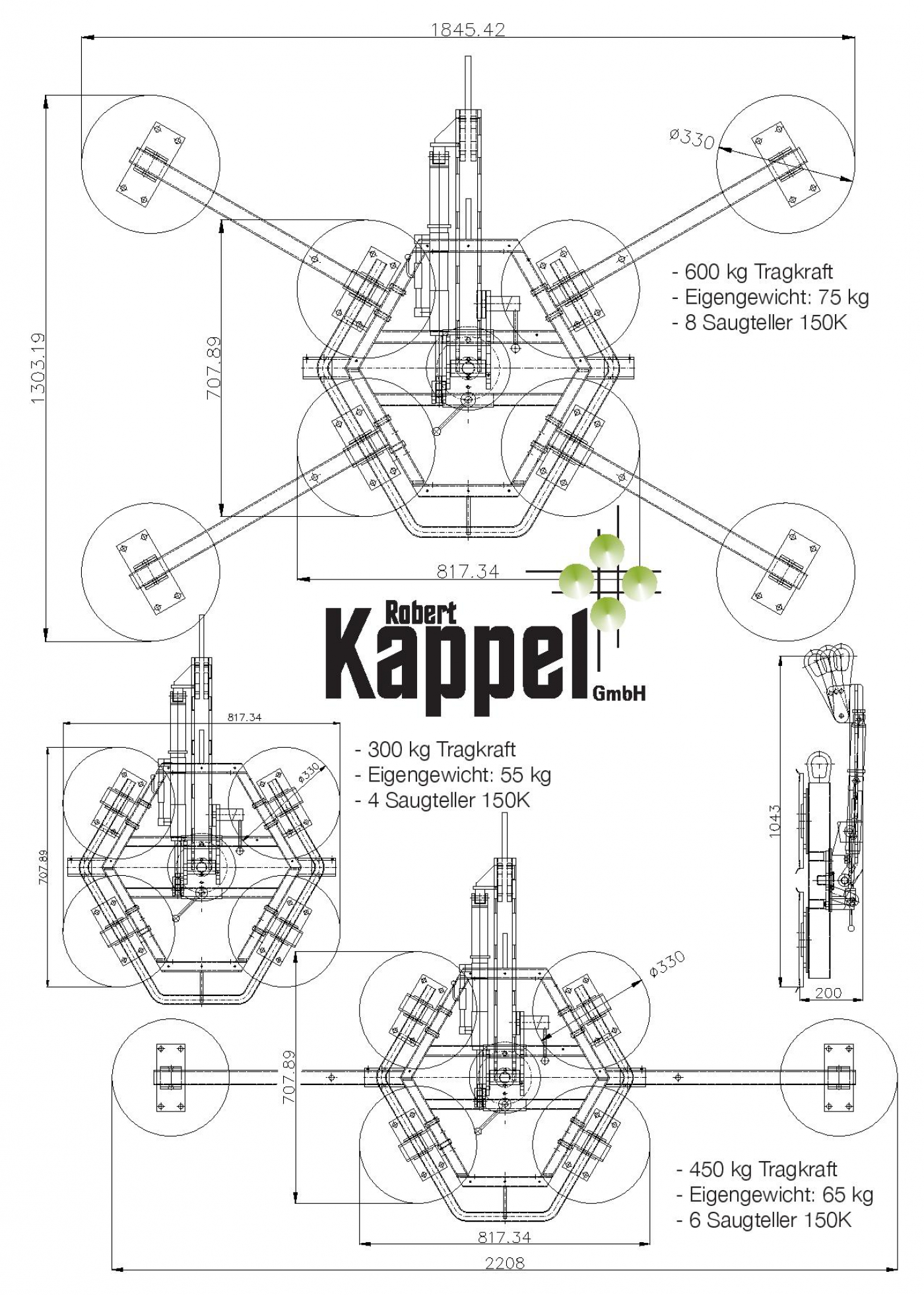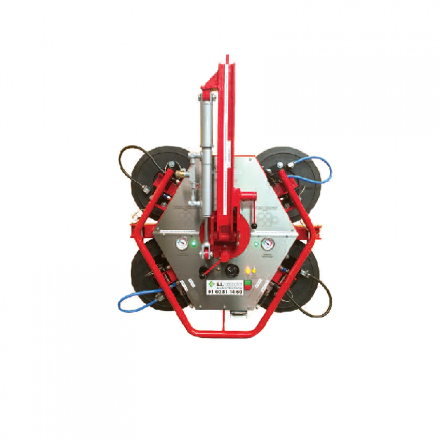 Při nosnosti 300 kg 4 sací disky pr. 330 mm– hmotnost 55 kg, velikost rámu 817x708x200 mm